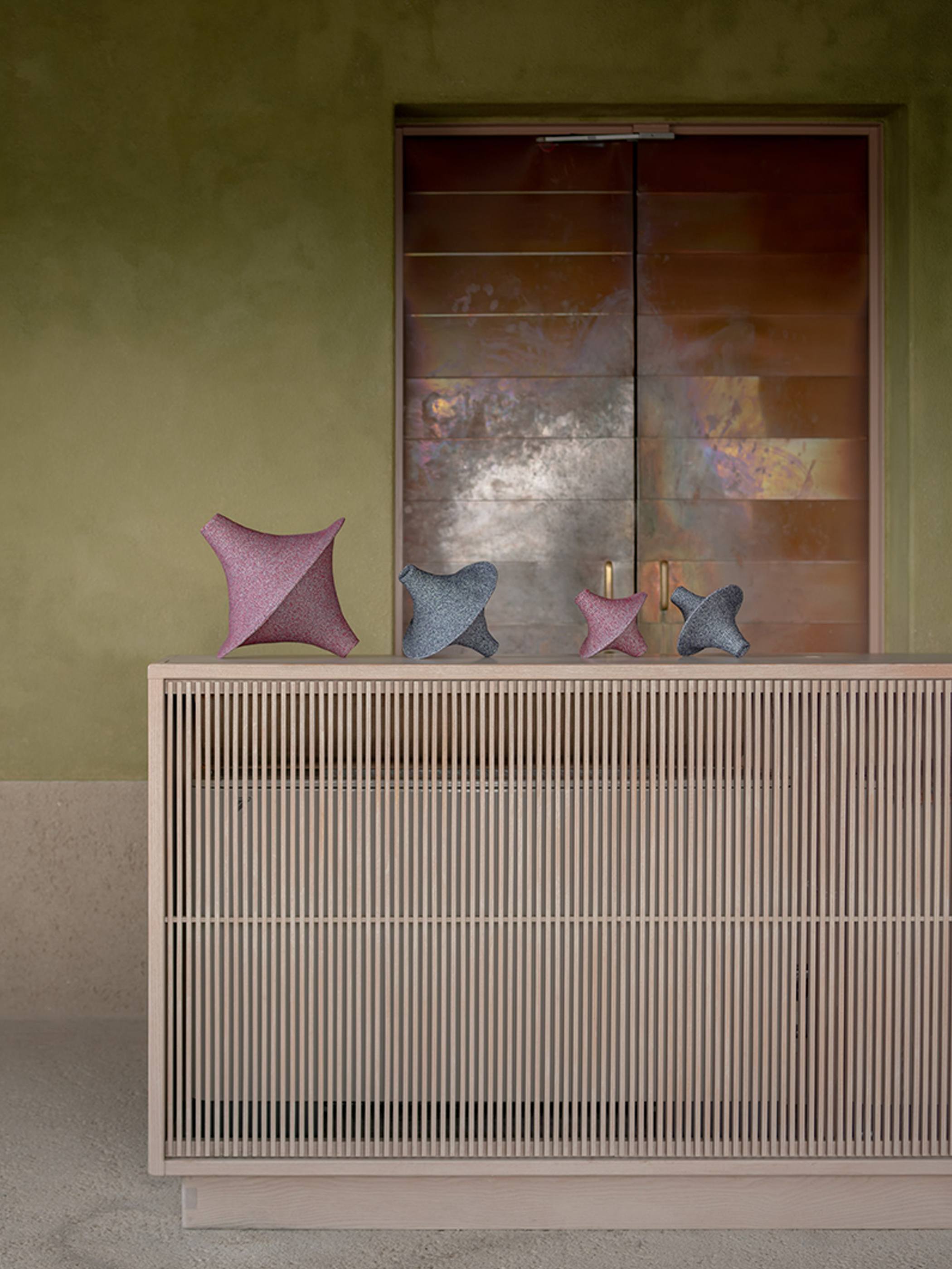 "Rombo", with its diagonally rolling presence, brings a graceful sense of motion to the space.